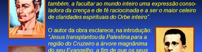 O CORAÇÃO DO MUNDO. No prefácio da obra escreveu Emmanuel: O Brasil não está somente destinado a suprir as necessidades materiais dos povos mais pobres do Planeta, mas, também, a facultar ao mundo inteiro uma expressão consoladora da crença e de fé raciocinada e a ser o maior celeiro de claridades espirituais do Orbe inteiro. O autor da obra esclarece, na introdução: Jesus transplantou da Palestina para a região do Cruzeiro a árvore magnânima do seu Evangelho, a fim de que os seus rebentos delicados florescessem de novo, frutificando em obras de amor para todas as criaturas.(…)