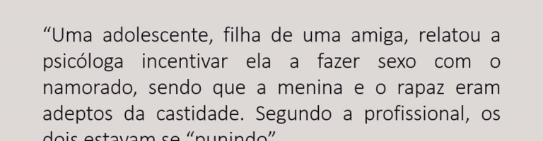 O problema dessa publicação é que produz um falso dualismo, como se a prática corrente em consultórios de psicólogos fosse estimular a sexualidade dos clientes. Nunca ouvi nenhuma corrente reconhecida da psicologia que estimule pessoas – em especial adolescentes – à prática sexual contra seus valores religiosos. Por outro lado, a prática CORRENTE na ideologia da chamada psicologia cristã é promover a castidade. Posso afirmar que, o caso trazido acima (um relato da “amiga, da amiga da minha vizinha da praia que me contou) só pode ser entendido de duas formas: a) uma interpretação errônea por parte do paciente de uma orientação do profissional ou b) uma péssima abordagem psicológica, onde uma terapeuta se arroga o direito de influenciar valores e crenças de seus clientes, estimulando a prática sexual entre um casal de namorados cristãos. Entretanto, o post insinua a falsa simetria de que “ambos os lados cometem erros“, quando em verdade a ideologia cristã é que induz a este tipo de doutrinação pela castidade, enquanto NENHUMA corrente da psicologia ensina, reproduz ou estimula a prática sexual de adolescentes que preferem não o praticar.
