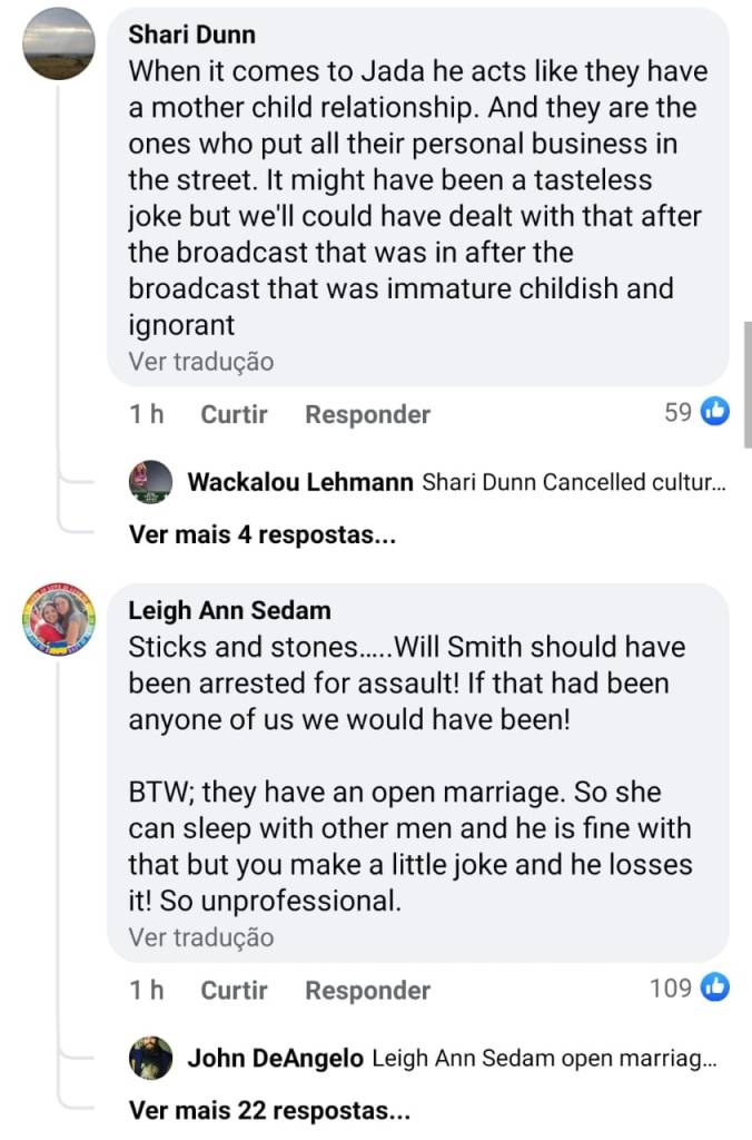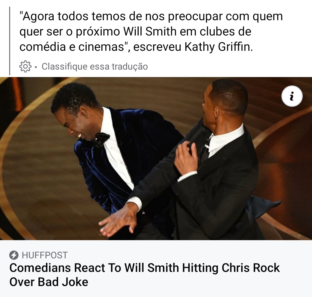 Dito isso, deixo claro que não achei a piada contada pelo Chris Rock no Oscar como sendo ofensiva. A piada contada compara Jada Smith com outra personagem que tinha o cabelo muito curto. Não vejo como isso pode ser inadequado se for dito por um comediante. Creio que a atitude do Will Smith foi uma imensa tolice, um brutal desrespeito com a audiência, uma falta de compostura e todo o espetáculo por ele protagonizado deveria ser reprovado em todas as dimensões.