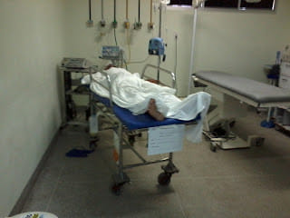 Quem explicou o caso foi um rapaz um pouco mais velho que havia empurrado a cadeira de rodas com o jovem semi desfalecido para a sala de pequenas cirurgias.
