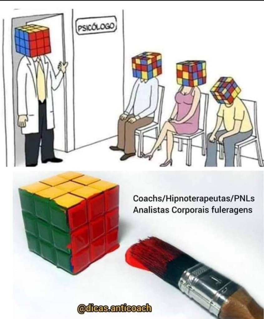 Discordo apenas da cabeça arrumadinha do psicólogo. Essa imagem pode dar a entender que a cabeça dele está com as neuroses ajeitadas, dobradinhas dentro das gavetas, empilhadas em perfeita ordem. Já a imagem do pincel significa que as formas “modernas” listados ao lado não se propõem a mudar a estrutura do Cubo Mágico – nossa alma – mas tão somente falseiam a sua aparência com recursos exógenos e, portanto, fugazes.